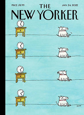 George Booth created his last New Yorker cartoon ten months before he died from complications of dementia at 96. The cartoon cover is a goofy white dog glancing at a clock. Is that funny? A dog checking the time?