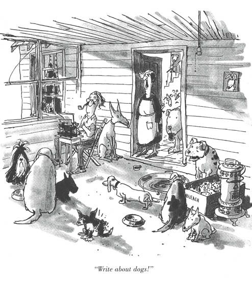 George Booth, the New Yorker cartoonist who died in November 2022, once created the funniest cartoon in memory. First of all, Booth’s silly line drawings were and remain funny enough–they don’t need captions. But the one I so love is a man sitting at his typewriter on a dilapidated porch wistfully smoking a pipe. Nine or ten dogs of different sizes and shapes laze around. There’s a bulbless socket hanging from the ceiling. His wife stands in the doorway. Caption: “Write about dogs!”