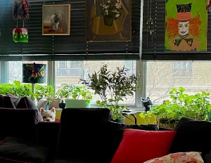 Henry jumps around to say he’s ready to go out and read his drizzled mail on the low hanging boxwood branches. There’s a shift on the sidewalk; less people than the day before, fewer parked cars, more birds. And Henry makes less and less whiffer stops. His friends must be on a later schedule, sleeping in. It’s the second week after all.